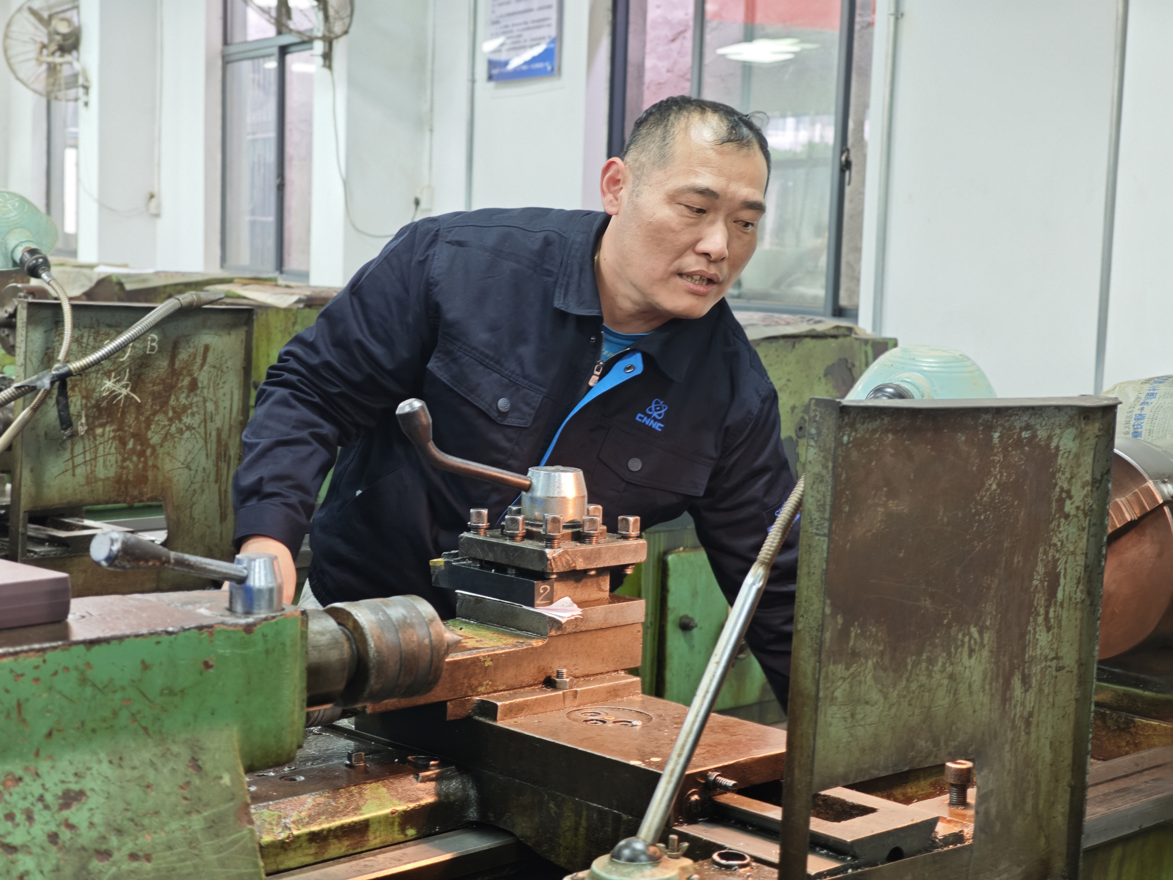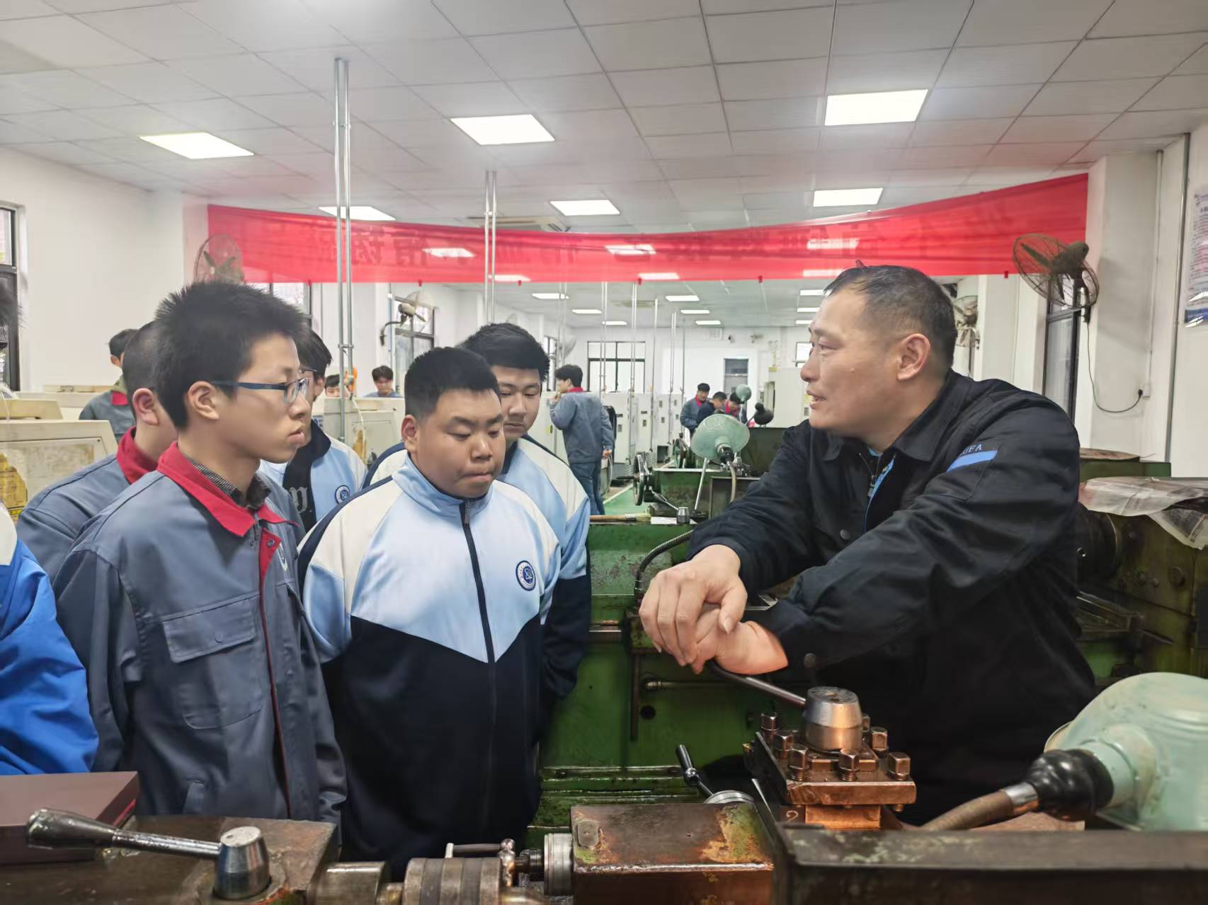互动环节结束后,优秀学生代表走进学校数控车间,朱大师为学生带来一场特别的“现场教学”。学生代表围在机床旁,朱大师轻轻按下启动按钮,机床发出沉稳的运转声。他一边操作一边讲解,学生近距离感受机械工艺的魅力,对今后的技能学习加注了动力。