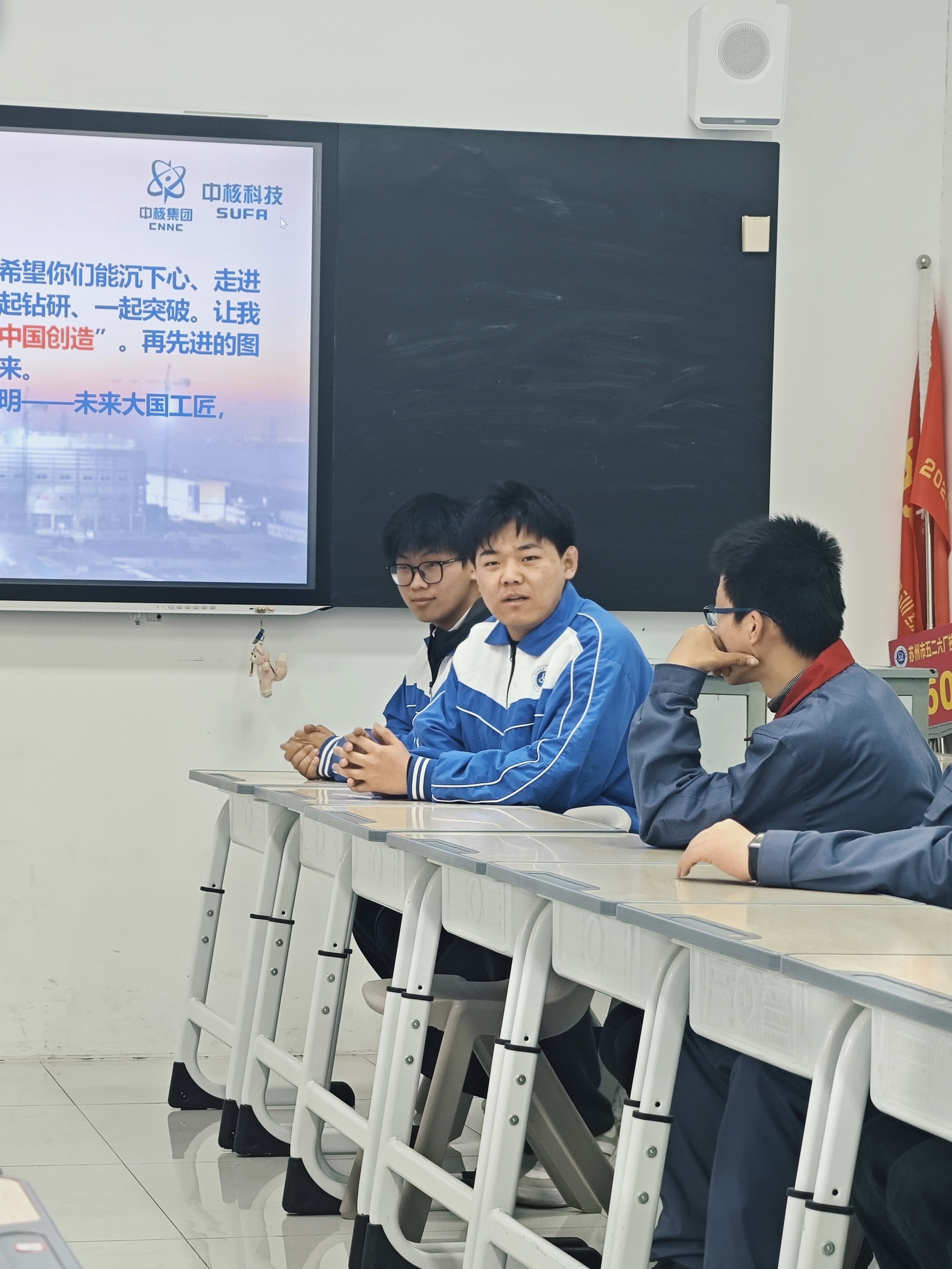 “核工业是国家战略产业,它所承载的使命和标准,对技术工人提出了最高要求。”朱大师目光坚定,“在这个平台上,我接触到的都是‘国之重器’,每一个零件都关系到核安全。这种责任感倒逼着我不断学习、不断精进。同时,集团为我们建立了完善的人才培养体系,从技能竞赛到技术研修,只要你肯努力,平台就会给你机会。”朱夏军大师耐心解答了学生关于参加技能比赛、技能学习技巧的提问,鼓励大家不要害怕失败,要从失败中总结经验,将技能的基本功打扎实,努力学习新知识,培养自己的创新思维,让青春在强核报国的征程中绽放光彩。